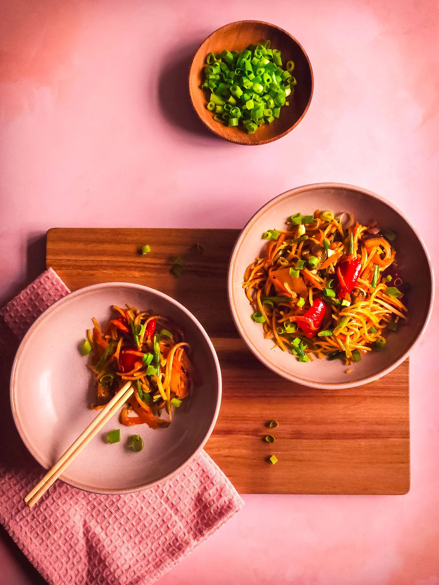 This is my weeknight stir-fry — quick, vibrant, and endlessly adaptable. On busy days, it’s the kind of meal I can count on: a mix of noodles, whatever vegetables I have to hand, and a glossy sauce that ties it all together. It’s comforting but still light, and I never get bored of it.
